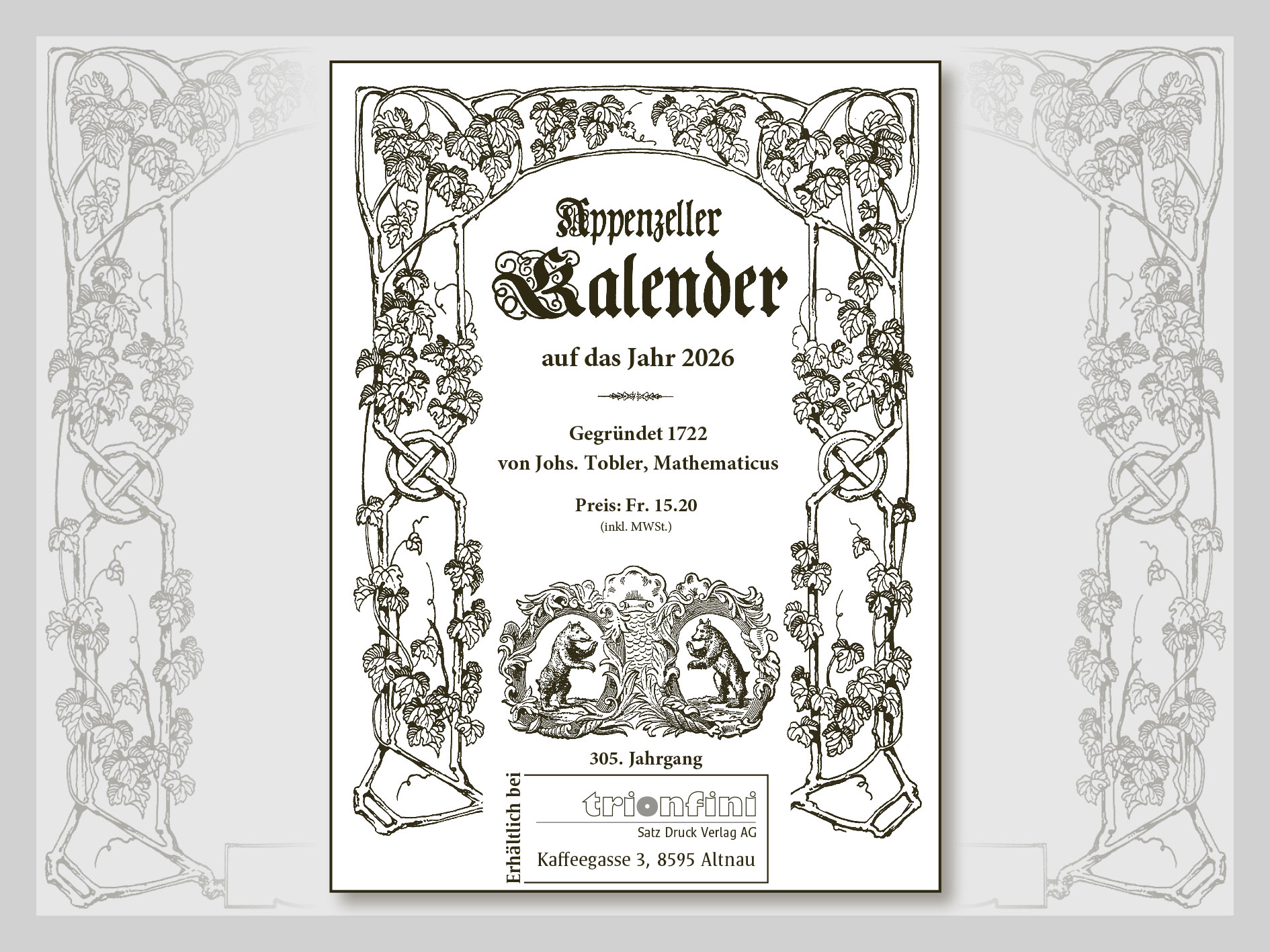 Ein treuer Begleiter durch das Jahr ist der Appenzeller Kalender, der als eines der ältesten Schweizer Medien auf das stolze Alter von 305 Jahren Rückschau halten kann. Während das äussere Erscheinungsbild der Tradition treu geblieben ist, präsentiert sich das Innere des Kalenders frisch und zeitgemäss. Unverändert aber gehören die Behördenverzeichnisse der Kantone beider Appenzell, St. Gallen und Thurgau zum Inhalt. Ebenfalls vertreten ist die Übersicht aller Märkte der Ostschweiz, die Wetterchronik und die Erklärung kalendarischer Begriffe wie Fronfasten, Hundstage sowie Obsi- und Nidsigend. Zum Kalenderinhalt gehören ferner die historischen Rückblicke auf das vergangene Jahr, Kurzgeschichten und eine geballte Ladung neuer Appenzeller Witze. Der Kalender ist für Fr. 15.20 bei uns erhältlich.